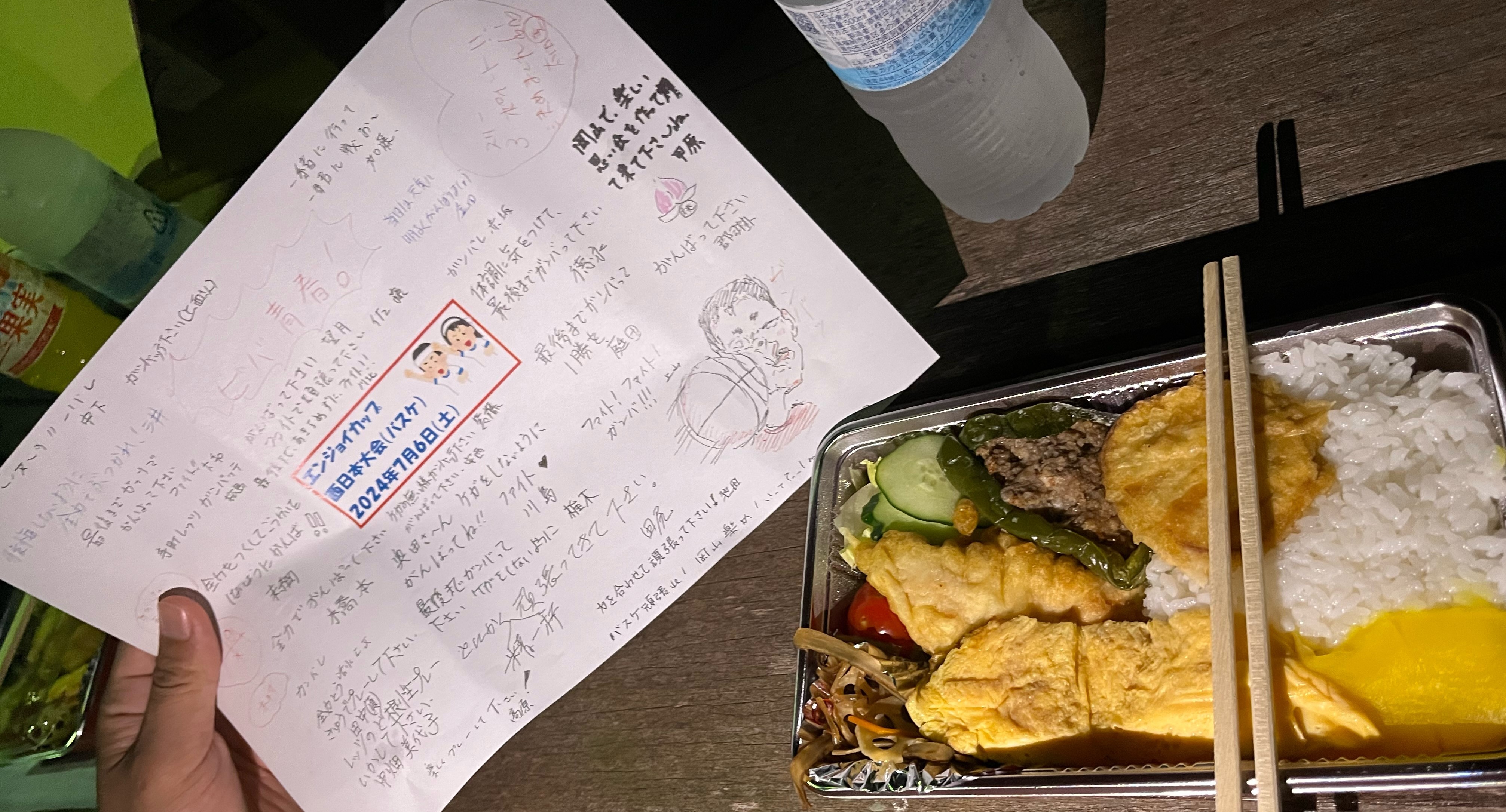 応援弁当を食べ