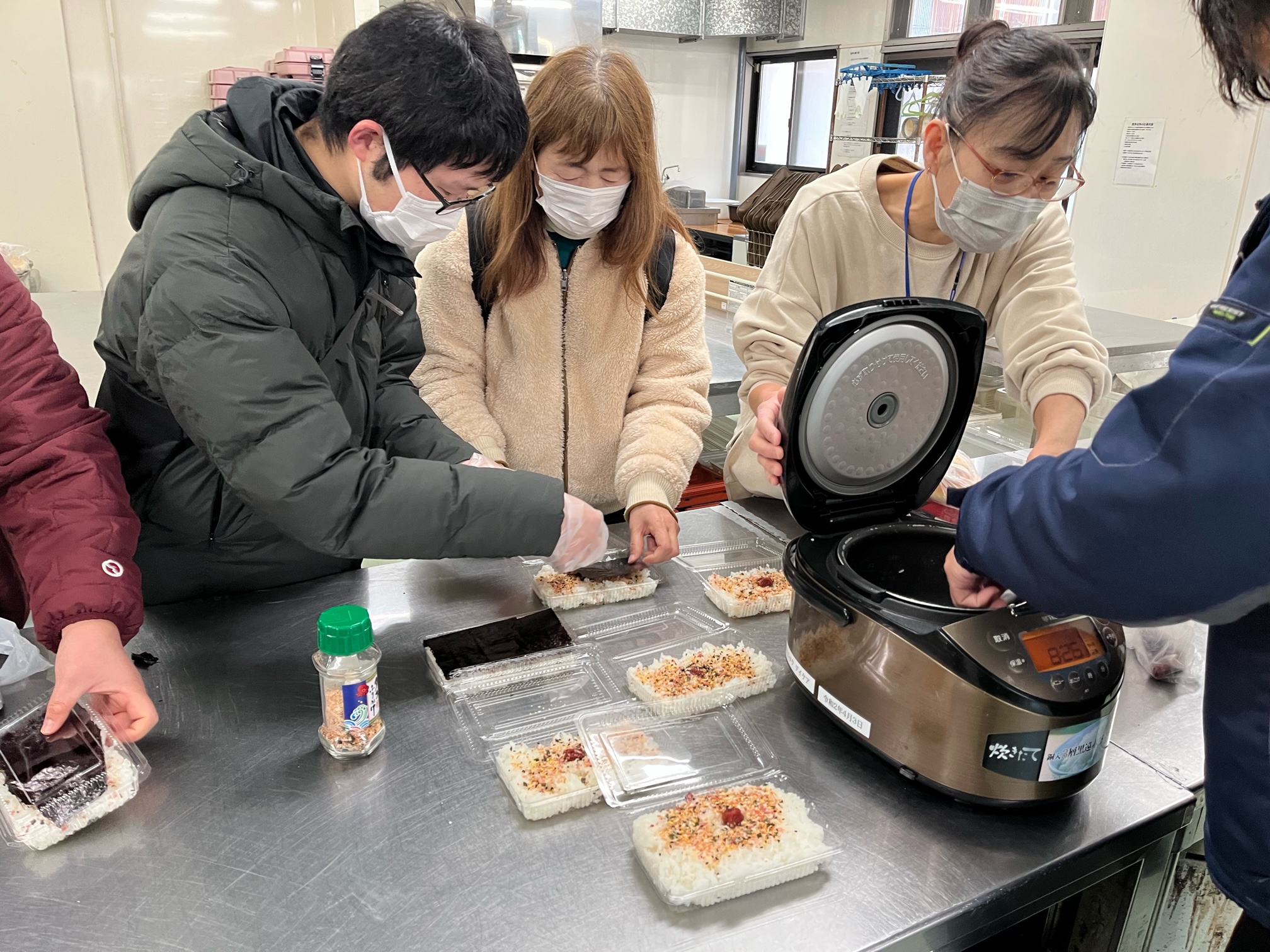 朝から、院長、スタッフ持ち込みの 海苔 ふりかけ 梅干し 配食からはモチモチのご飯を頂き出発前に みんなで昼の弁当を作成しました
